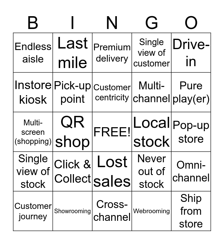 This bingo card has a free space and 25 words: Click & Collect, Cross-channel, Customer centricity, Customer journey, Drive-in, Endless aisle, Instore kiosk, Last mile, Local stock, Lost sales, Multi-channel, Multi-screen (shopping), Never out of stock, Omni-channel, Pick-up point, pick-up & return point, Pop-up store, Premium delivery, Pure play(er), QR shop, Ship from store, Showrooming, Single view of stock, Single view of customer and Webrooming.