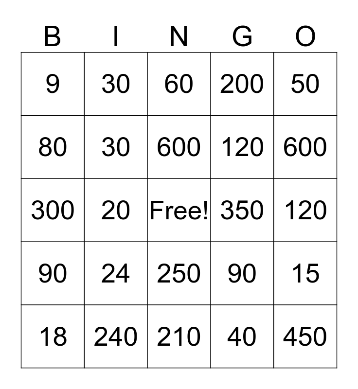 This bingo card has a free space and 24 words: 24, 240, 600, 18, 50, 9, 80, 30, 350, 250, 120, 300, 90, 15, 30, 40, 120, 60, 600, 20, 450, 90, 200 and 210.