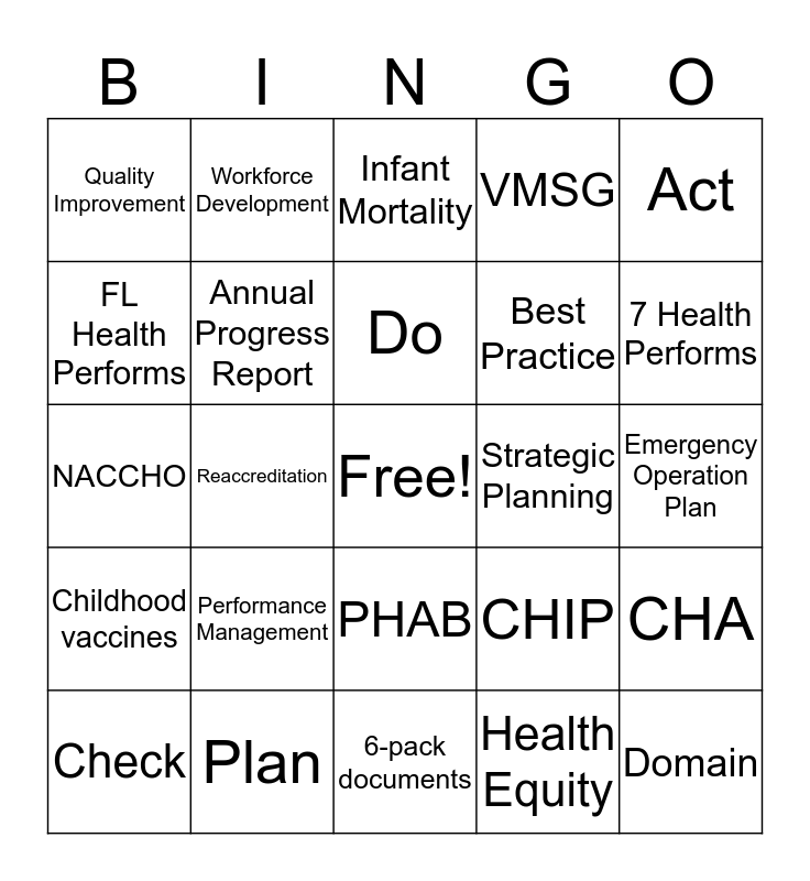 This bingo card has a free space and 24 words: Performance Management, Plan, Do, Check, Act, Quality Improvement, FL Health Performs, Workforce Development, Strategic Planning, PHAB, Best Practice, NACCHO, CHIP, CHA, Annual Progress Report, Health Equity, Emergency Operation Plan, Infant Mortality, 7 Health Performs, Reaccreditation, Domain, Childhood vaccines, VMSG and 6-pack documents.