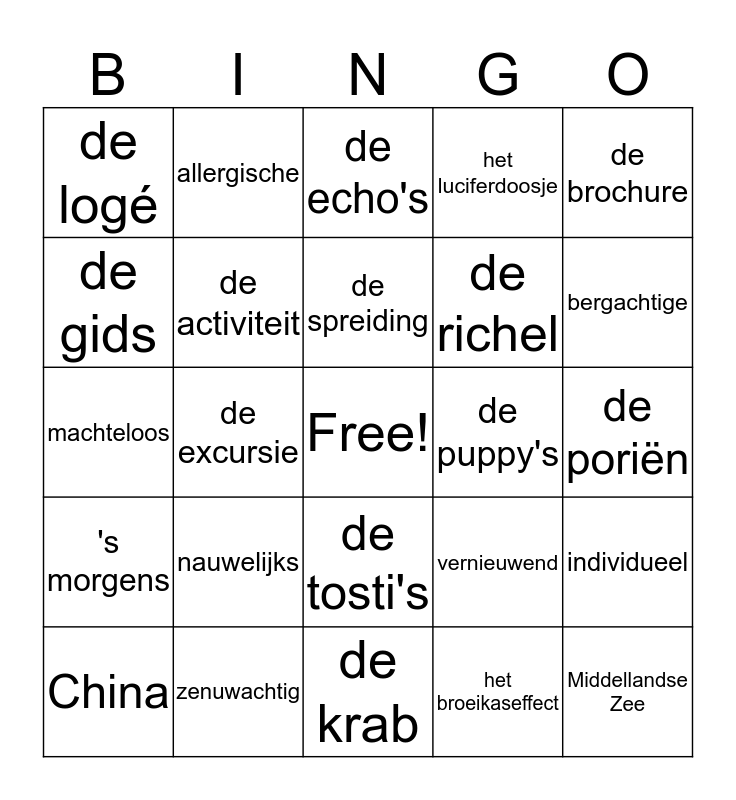 This bingo card has a free space and 39 words: de documentaire, de melodieën, de injectie, vernieuwend, individueel, 's morgens, de excursie, wanneer, de puppy's, de poriën, de gids, allergische, het puddinkje, bergachtige, machteloos, nauwelijks, de tosti's, het luciferdoosje, het cadeautje, China, de activiteit, de spreiding, het broeikaseffect, de brochure, het extraatje, zenuwachtig, de krab, de ijsthee, de bloemetjes, de logé, de thema's, grootste, de richel, Middellandse Zee, de wandelroute, de contouren, de echo's, atletisch and de selectie.