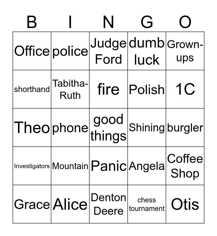 This bingo card has a free space and 40 words: Lake Michigan, Theo, bomb, Tabitha-Ruth, Alice, Panic, fire, scoff, Grown-ups, Investigators, phone, dumb luck, Otis, burgler, Shining, Mountain, 4D, Office, Ezra Ford, Judge Ford, Coffee Shop, chess tournament, Polish, shorthand, tomato sauce, burgler, Turtle, engagement ring, Flora, Madame Hoo, Sunset Towers, Grace, Grain, Angela, 1C, Denton Deere, purple sparks, insurance, police and decorator.