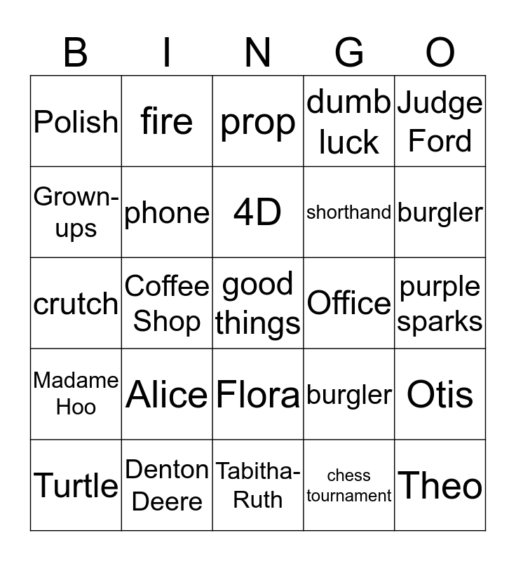 This bingo card has a free space and 47 words: Lake Michigan, Theo, bomb, Tabitha-Ruth, Alice, Panic, fire, scoff, Grown-ups, Investigators, phone, dumb luck, Otis, burgler, Shining, Mountain, 4D, Office, Ezra Ford, Judge Ford, Coffee Shop, chess tournament, Polish, shorthand, tomato sauce, burgler, Turtle, engagement ring, Flora, Madame Hoo, Sunset Towers, Grace, Grain, Angela, 1C, Denton Deere, purple sparks, insurance, police, decorator, Sydelle, prop, crutch, newspaper man, Westingtown, Violet Westing and Westing file.