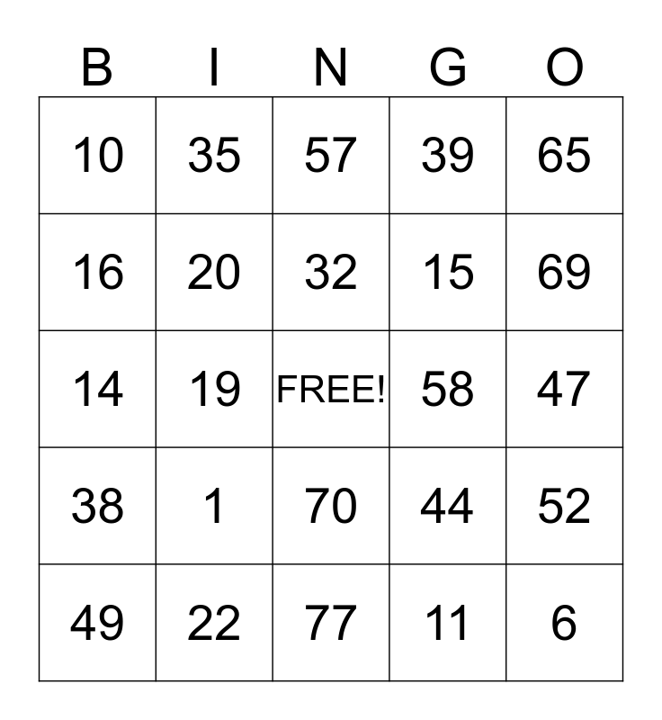 This bingo card has a free space and 24 words: 1, 22, 32, 49, 65, 10, 16, 35, 58, 70, 15, 14, 44, 52, 20, 11, 47, 57, 69, 19, 6, 38, 39 and 77.