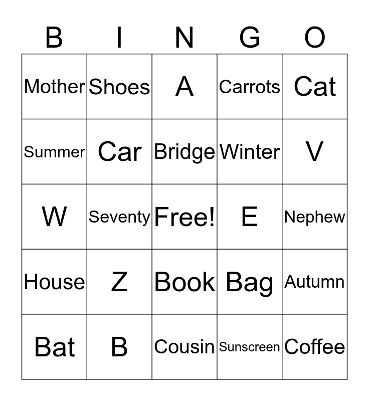 This bingo card has a free space and 33 words: One, Sixty, Seventy, Fifteen, House, Car, Cat, Bat, Shoes, Table, Bridge, A, B, D, E, V, B, W, Z, Bag, Book, Kite, Mother, Nephew, Cousin, Coffee, Carrots, Winter, Summer, Autumn, Spring, Sunscreen and Chilly.
