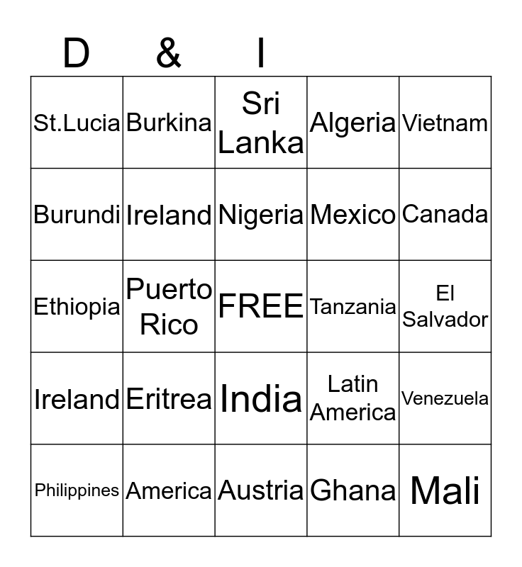 This bingo card has a free space and 24 words: Eritrea, America, Nigeria, Philippines, Vietnam, St.Lucia, Burundi, Burkina, Tanzania, India, Mexico, Ethiopia, Latin America, Venezuela, Ireland, Ghana, El Salvador, Sri Lanka, Canada, Puerto Rico, Mali, Ireland, Algeria and Austria.