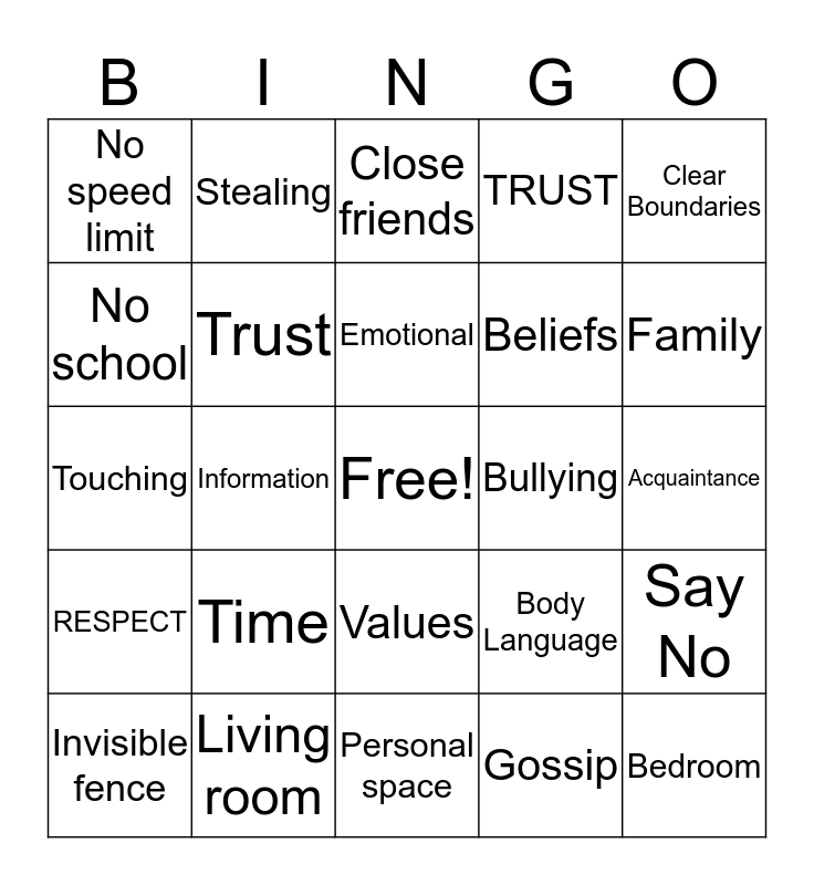 This bingo card has a free space and 25 words: Time, Personal space, Emotional, Invisible fence, Clear Boundaries, No speed limit, No school, Stealing, Bullying, Values, Beliefs, Touching, Body Language, Say No, Trust, Stranger, Acquaintance, Close friends, Family, Information, Bedroom, Living room, RESPECT, TRUST and Gossip.