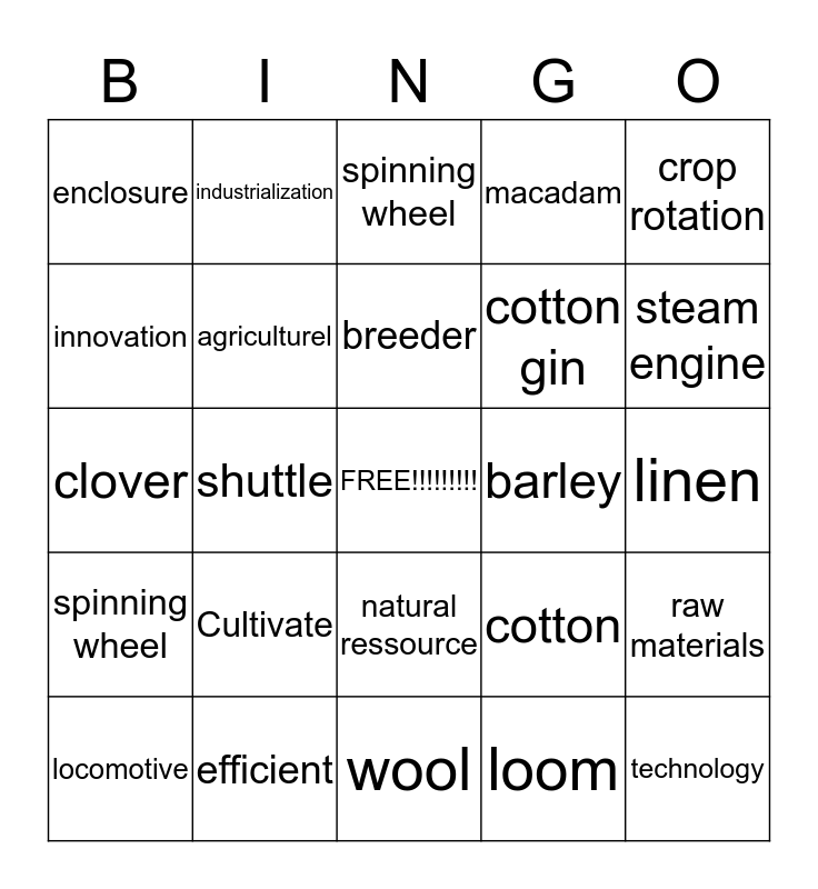 This bingo card has a free space and 24 words: Cultivate, efficient, breeder, locomotive, crop rotation, enclosure, innovation, industrialization, barley, natural ressource, cotton gin, clover, cotton, raw materials, agriculturel, loom, linen, spinning wheel, steam engine, shuttle, technology, spinning wheel, macadam and wool.