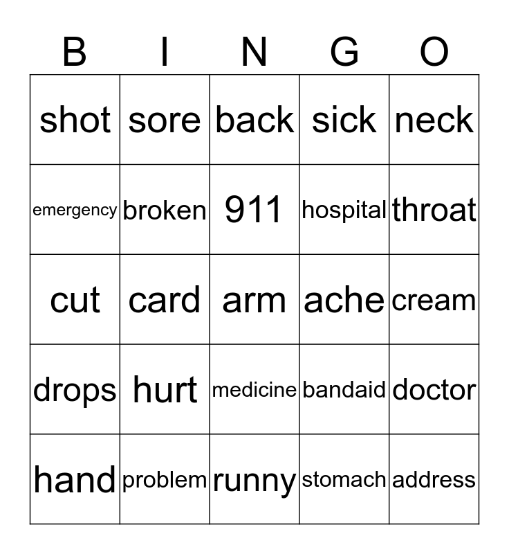 This bingo card has 43 words: body, arm, leg, hand, feet, stomach, back, chest, neck, problem, sick, ache, medicine, hurt, nose, runny, vomiting, cut, cough, throat, sore, fever, rash, shot, aspirin, cream, ointment, pills, bandaid, drops, name, doctor, number, card, insurance, interpreter, address, 911, emergency, hospital, ambulance, broken and bleeding.