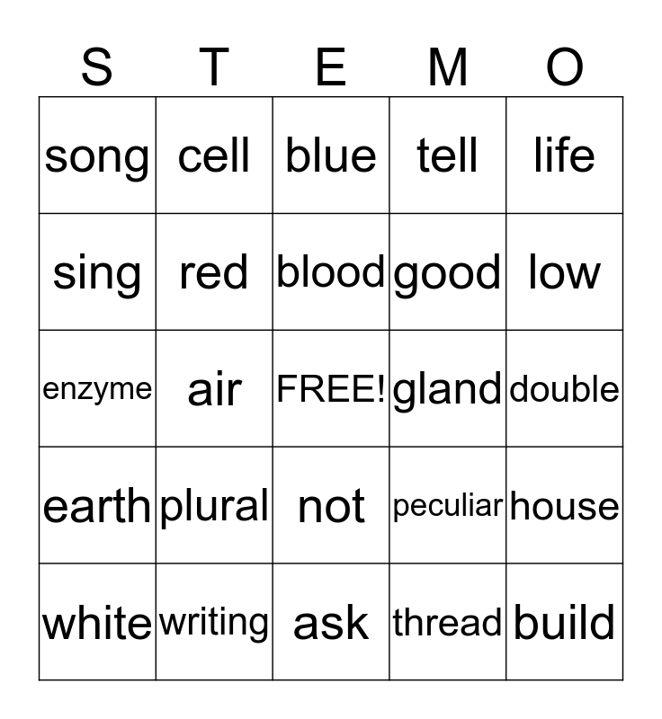 This bingo card has a free space and 32 words: thread, light, air, out, earth, red, life, house, cell, bad, blood, blue, intestine, green, gland, on, white, enzyme, not, plural, peculiar, speak, double, writing, build, tell, good, sing, song, ask, away and low.