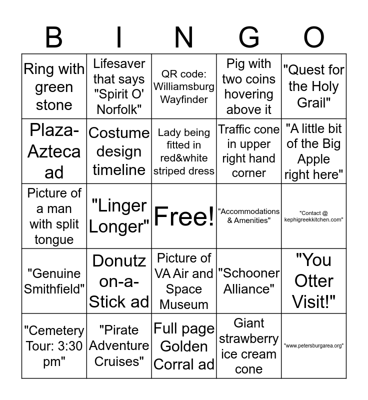 This bingo card has a free space and 24 words: Donutz on-a-Stick ad, "Pirate Adventure Cruises", Lady being fitted in red&white striped dress, "Cemetery Tour: 3:30 pm", "Quest for the Holy Grail", Ring with green stone, Plaza-Azteca ad, Lifesaver that says "Spirit O' Norfolk", "Accommodations & Amenities", Picture of VA Air and Space Museum, Traffic cone in upper right hand corner, Picture of a man with split tongue, "Schooner Alliance", "You Otter Visit!", Costume design timeline, Giant strawberry ice cream cone, "Contact @ kephigreekkitchen.com", QR code: Williamsburg Wayfinder, "A little bit of the Big Apple right here", "Linger Longer", "www.petersburgarea.org", "Genuine Smithfield", Pig with two coins hovering above it and Full page Golden Corral ad.