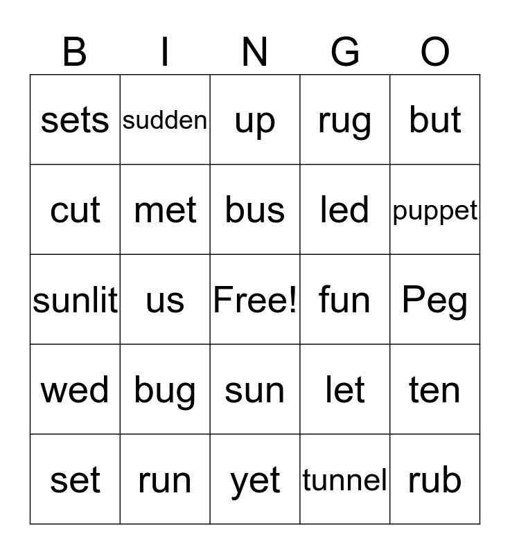 This bingo card has a free space and 24 words: bug, run, bus, set, but, sets, cut, sudden, fun, sun, led, sunlit, let, ten, met, tunnel, Peg, up, puppet, us, rub, wed, rug and yet.