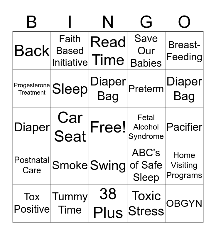 This bingo card has a free space and 29 words: Tox Positive, Count The Kicks, Car Seat, Alone, Back, Read Time, Sleep, Smoke, Fetal Alcohol Syndrome, Tummy Time, Pacifier, OBGYN, 38 Plus, Toxic Stress, Diaper Bag, Trimester, Swing, Postnatal Care, Breast- Feeding, Diaper, ABC's of Safe Sleep, Lullaby, Preterm, Progesterone Treatment, Save Our Babies, Faith Based Initiative, Home Visiting Programs, Diaper Bag and OBGYN.