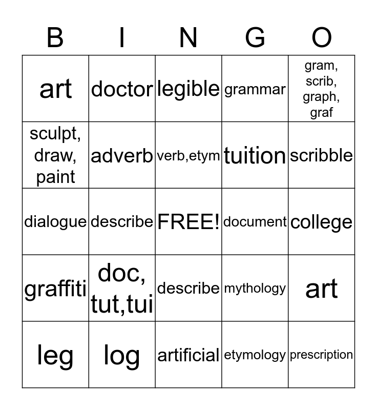 This bingo card has a free space and 24 words: doc, tut,tui, log, verb,etym, leg, gram, scrib, graph, graf, art, sculpt, draw, paint, doctor, document, describe, tuition, dialogue, mythology, art, adverb, etymology, college, legible, scribble, describe, prescription, graffiti, grammar and artificial.