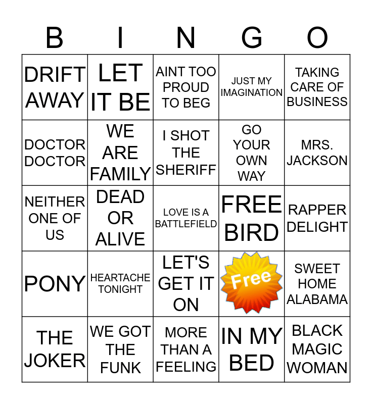 This bingo card has 1 images and 24 words: HEARTACHE TONIGHT, MORE THAN A FEELING, I SHOT THE SHERIFF, THE JOKER, TAKING CARE OF BUSINESS, DRIFT AWAY, DOCTOR DOCTOR, LET IT BE, FREE BIRD, LET'S GET IT ON, GO YOUR OWN WAY, NEITHER ONE OF US, SWEET HOME ALABAMA, WE ARE FAMILY, BLACK MAGIC WOMAN, RAPPER DELIGHT, AINT TOO PROUD TO BEG, MRS. JACKSON, DEAD OR ALIVE, LOVE IS A BATTLEFIELD, WE GOT THE FUNK, PONY, JUST MY IMAGINATION and IN MY BED.