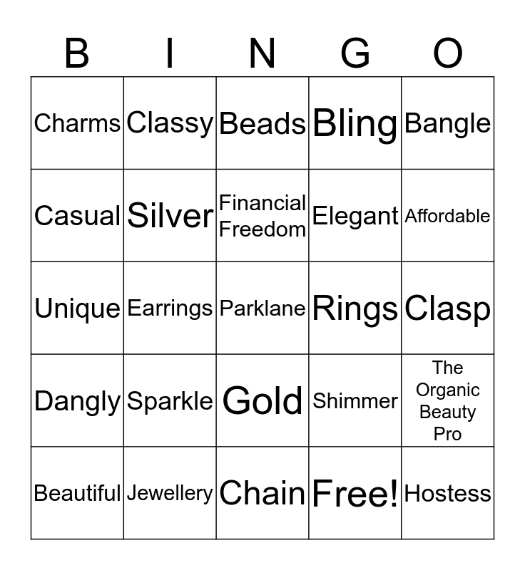 This bingo card has 30 words: Jewellery, Necklace, Earrings, Bracelet, Charms, Beads, Silver, Gold, Rings, Chain, Clasp, Parklane, Free!, Hostess, Affordable, Bold, Shimmer, Dangly, Sparkle, Bangle, Unique, Teardrop, Classy, Elegant, Casual, Bling, The Organic Beauty Pro, Beautiful, Financial Freedom and Fashion Director.