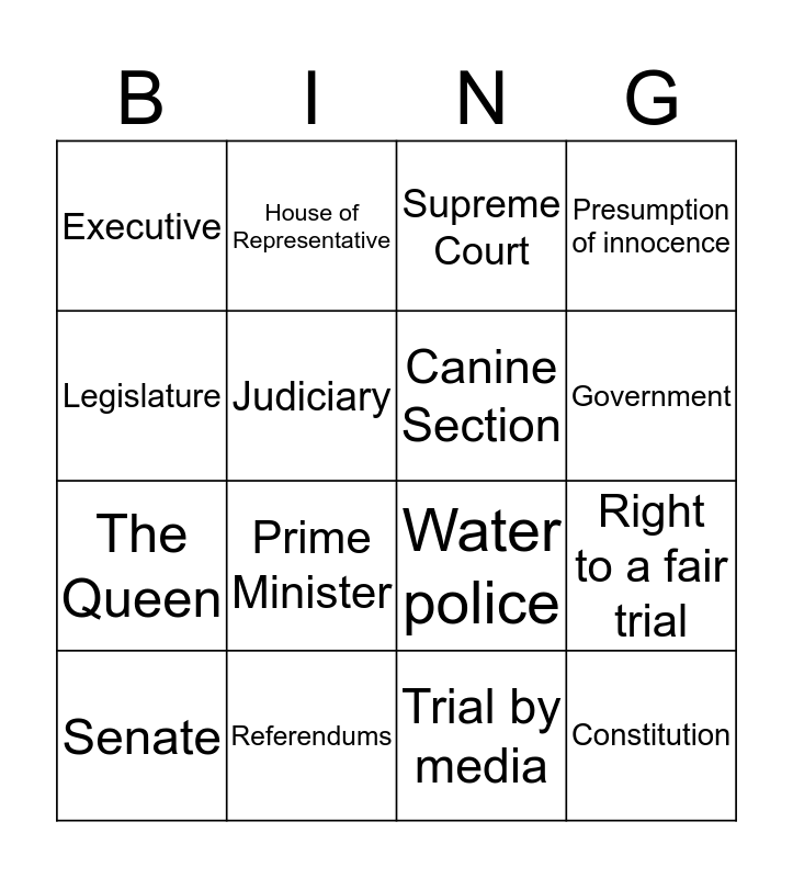 This bingo card has 23 words: Constitution, Bill, Government, Federal government, Legislature, Executive, Judiciary, House of Representative, Senate, Governor-General, Prime Minister, The Queen, High Court, Bicameral System, Referendums, Magistrates court, Supreme Court, Water police, Canine Section, Right to a fair trial, Presumption of innocence, Trial by media and Right to legal representation.