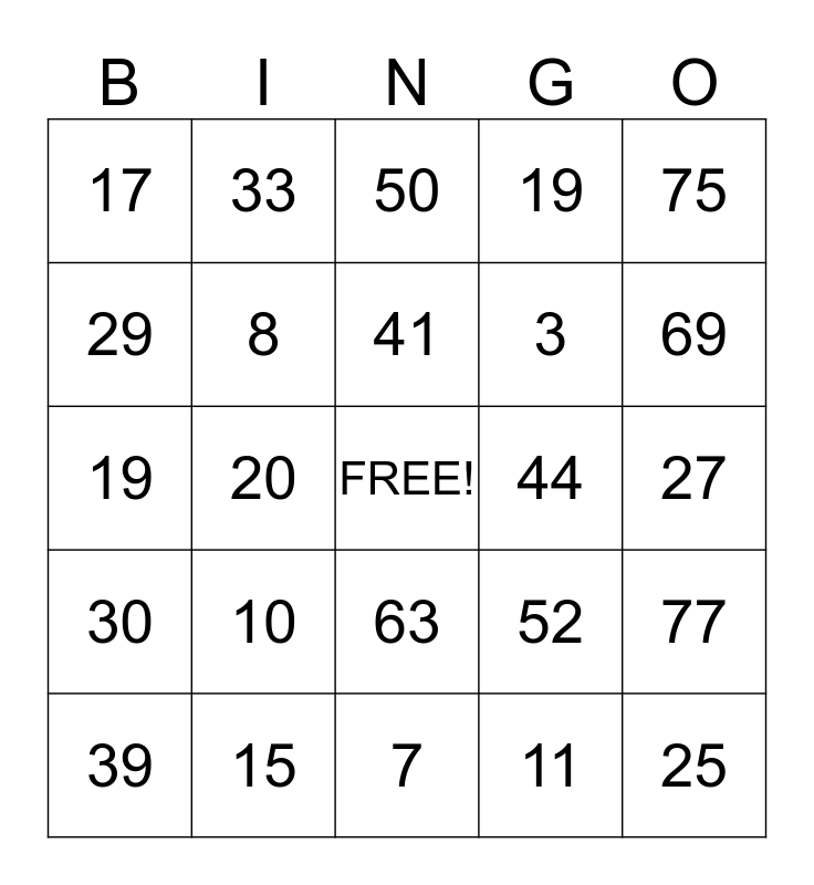 This bingo card has a free space and 24 words: 10, 15, 41, 39, 75, 17, 29, 33, 44, 63, 3, 19, 52, 77, 8, 11, 27, 50, 69, 20, 25, 30, 19 and 7.