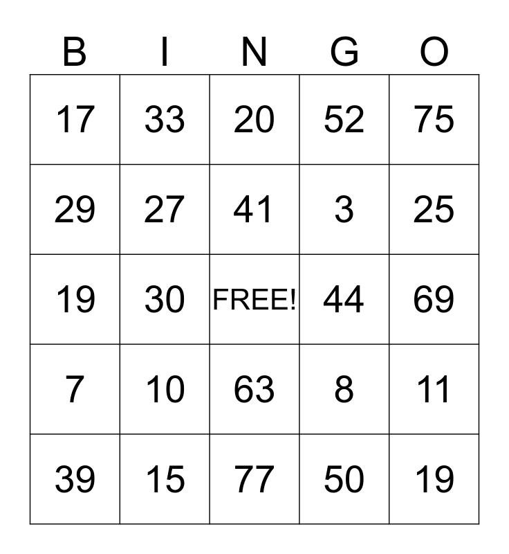 This bingo card has a free space and 24 words: 10, 15, 41, 39, 75, 17, 29, 33, 44, 63, 3, 19, 8, 11, 27, 50, 69, 20, 25, 30, 19, 7, 52 and 77.