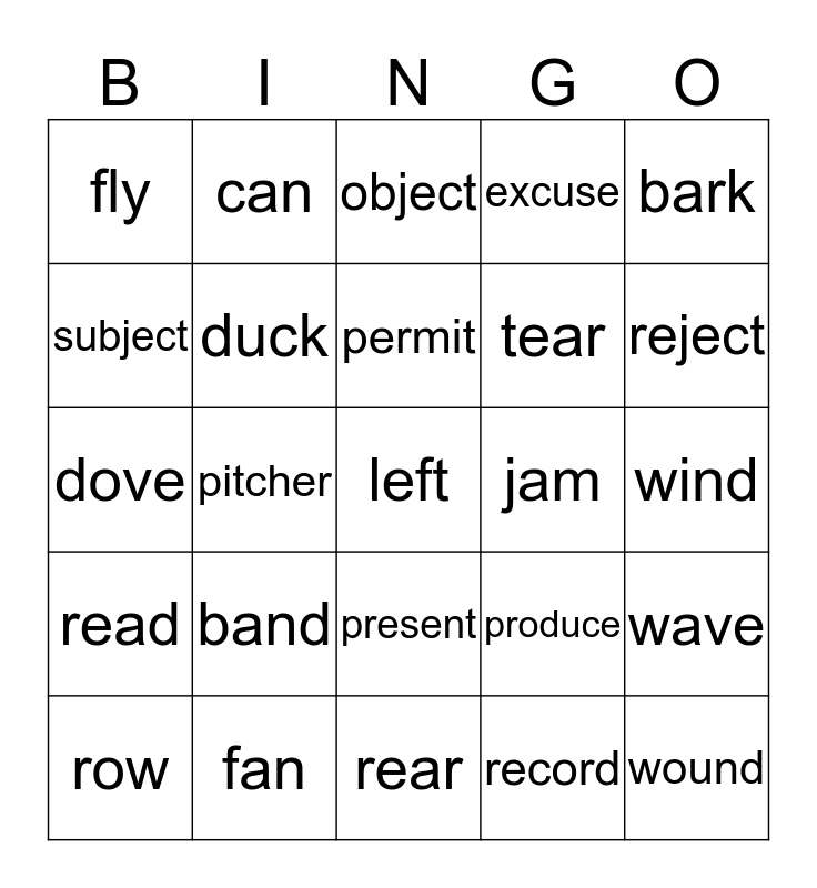 This bingo card has a free space and 24 words: band, fan, permit, row, bark, fly, subject, can, jam, present, tear, dove, produce, wave, duck, record, wind, object, reject, pitcher, wound, read, excuse and rear.