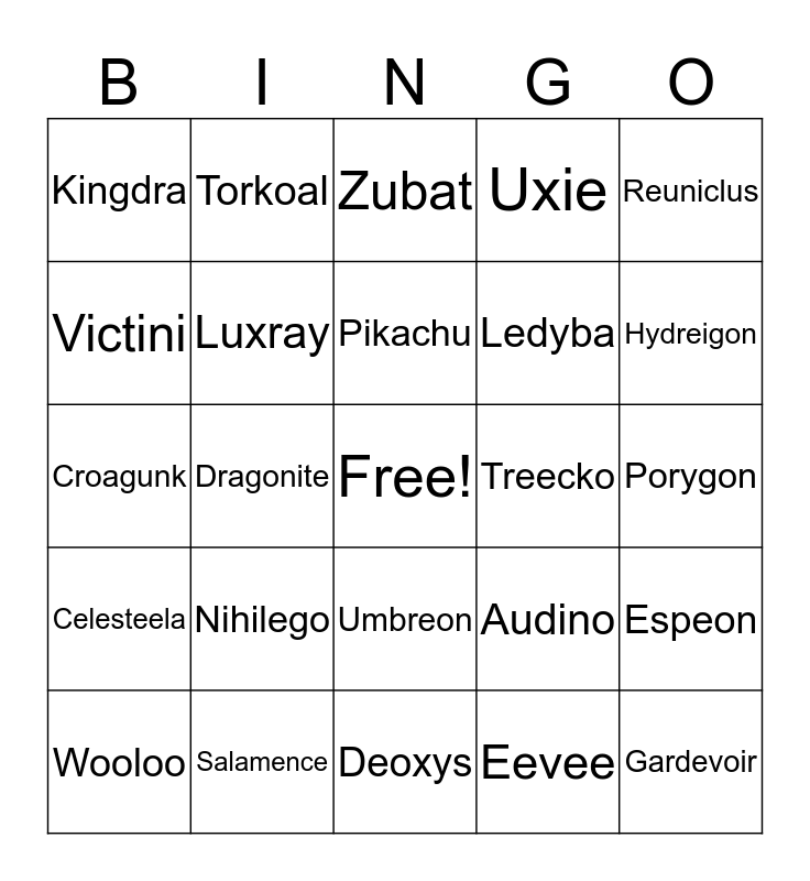 This bingo card has a free space and 24 words: Nihilego, Salamence, Pikachu, Wooloo, Reuniclus, Kingdra, Victini, Torkoal, Treecko, Umbreon, Ledyba, Croagunk, Audino, Espeon, Luxray, Eevee, Porygon, Zubat, Hydreigon, Dragonite, Gardevoir, Celesteela, Uxie and Deoxys.