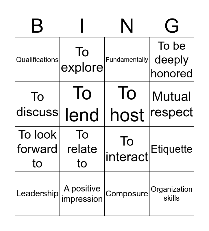 This bingo card has 34 words: A response, To have in common, To engage in, Prejudice, Organization skills, To host, To discuss, Diplomacy, To explore, To require, Mutual respect, Fundamentally, Ambassador, Informal speech, A positive impression, To relate to, To give the benefit of the doubt, To interact, A resume, A job application, To debrief, Guidenes, Qualifications, Composure, Initative, Leadership, To be deeply honored, To be supportive, To look forward to, To lend, To attend, Etiquette, Adaptability and Pitch.