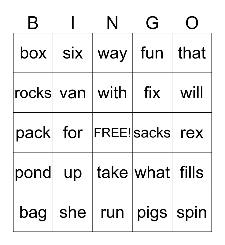 This bingo card has a free space and 24 words: up, she, with, bag, that, box, rocks, six, sacks, take, fix, pack, what, fills, van, pigs, rex, way, will, for, spin, pond, fun and run.