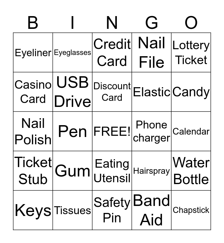 This bingo card has a free space and 25 words: Gum, Safety Pin, Discount Card, Keys, Lottery Ticket, Eyeliner, Casino Card, Eyeglasses, Phone charger, Eating Utensil, Elastic, Nail Polish, Hairspray, Water Bottle, USB Drive, Food, Calendar, Credit Card, Candy, Pen, Chapstick, Tissues, Ticket Stub, Nail File and Band Aid.