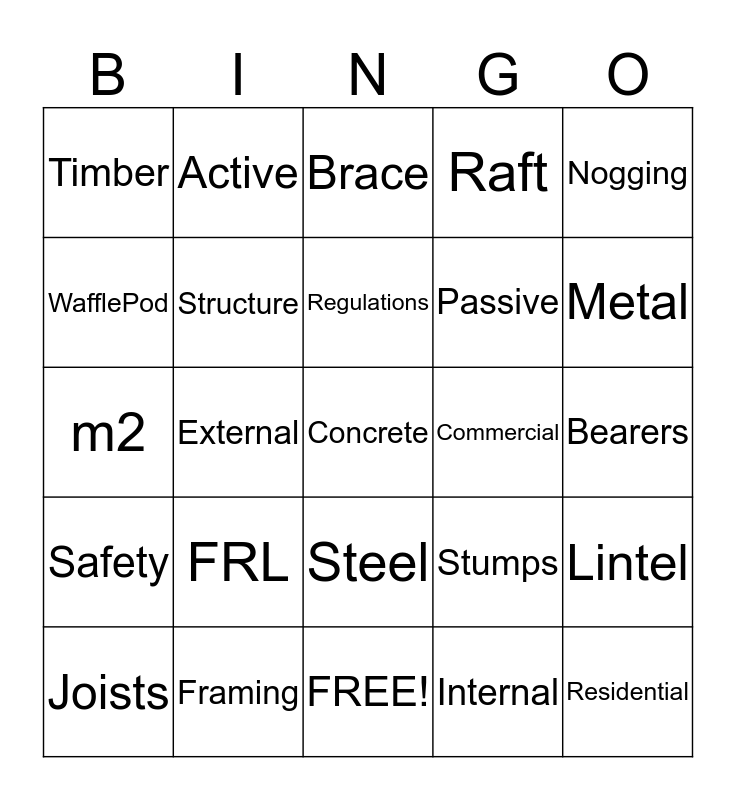 This bingo card has 31 words: FREE!, Brick, External, Truss, Timber, Brace, Structure, Stumps, Commercial, Internal, Bearers, Concrete, Residential, Footing, Metal, Classification, Lintel, FRL, Safety, Steel, Nogging, Insulation, Joists, Active, Passive, WafflePod, Raft, m2, Framing, Regulations and Trade.