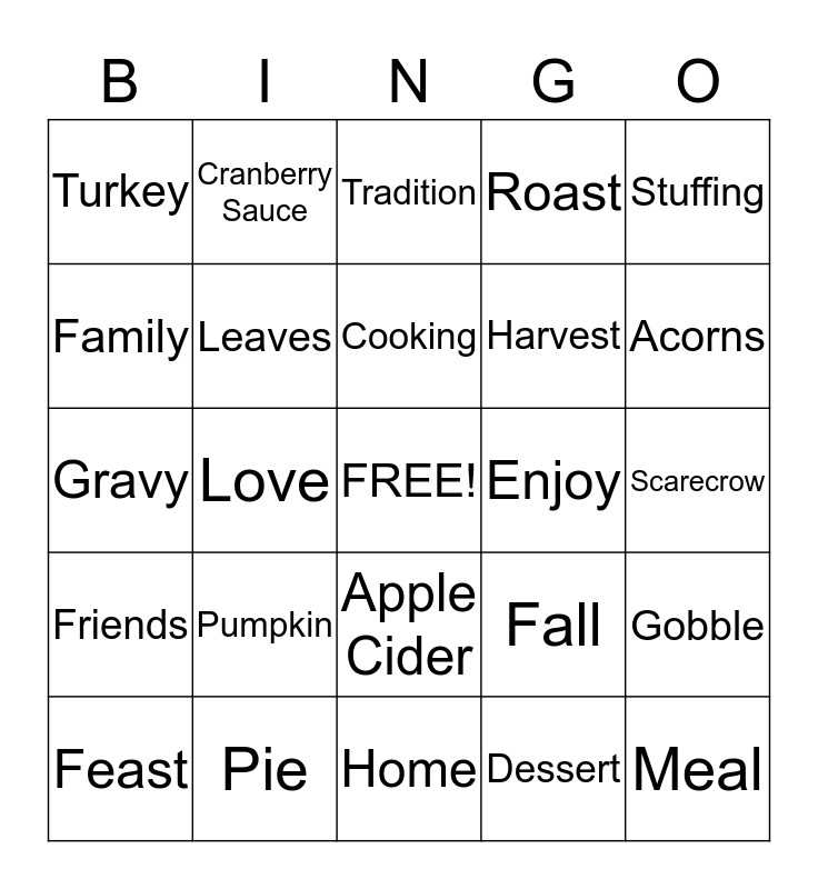 This bingo card has a free space and 24 words: Pumpkin, Pie, Cooking, Feast, Stuffing, Turkey, Family, Cranberry Sauce, Enjoy, Apple Cider, Harvest, Gravy, Fall, Gobble, Leaves, Dessert, Scarecrow, Tradition, Acorns, Love, Meal, Friends, Roast and Home.