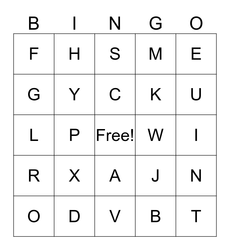 This bingo card has a free space and 26 words: A, B, C, D, E, F, G, H, I, J, K, L, N, O, P, Q, M, R, S, T, U, V, W, X, Y and Z.
