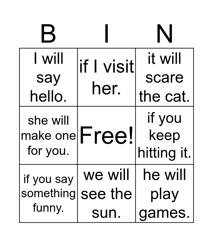 This bingo card has a free space and 10 words: we will see the sun., it will scare the cat., I will say hello., he will play games., she will make one for you., if you say something funny., if I visit her., if the weather is warm., if you keep hitting it. and if she gets a good score..