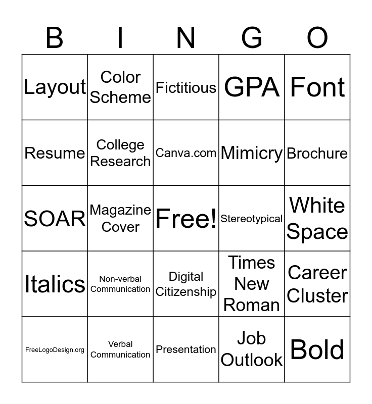This bingo card has a free space and 24 words: Non-verbal Communication, Verbal Communication, Canva.com, FreeLogoDesign.org, Font, Layout, Resume, Color Scheme, Stereotypical, Digital Citizenship, Mimicry, SOAR, Times New Roman, Career Cluster, College Research, Job Outlook, White Space, Fictitious, Brochure, Magazine Cover, Bold, Italics, GPA and Presentation.