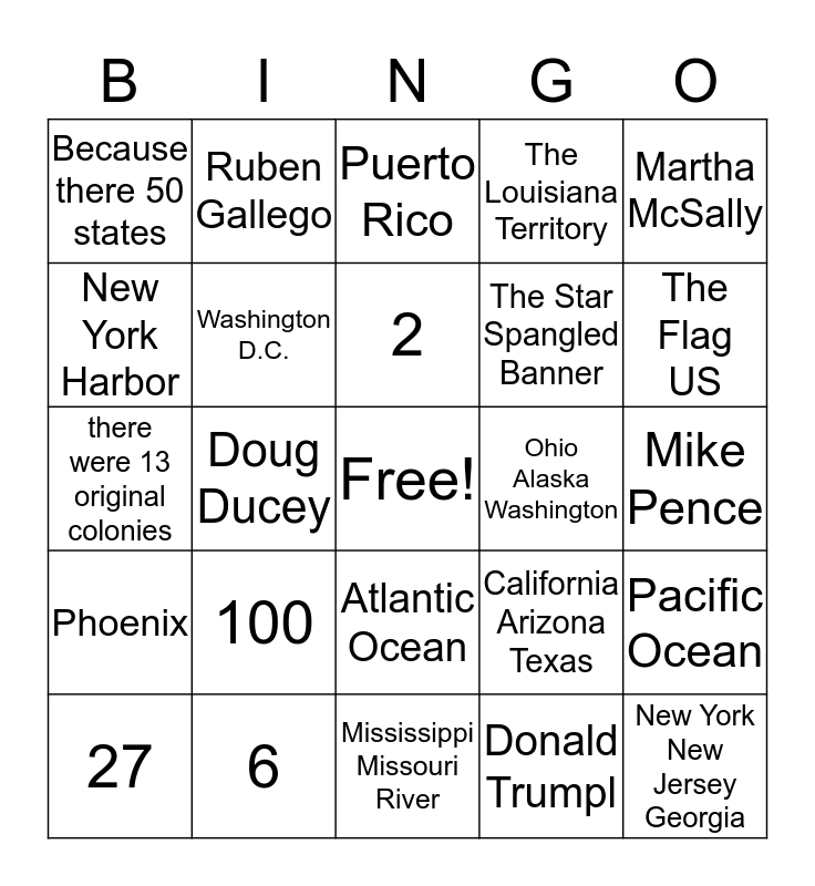 This bingo card has a free space and 24 words: 100, 6, 2, 27, Martha McSally, Because there 50 states, New York Harbor, Ruben Gallego, Ohio Alaska Washington, Atlantic Ocean, The Star Spangled Banner, there were 13 original colonies, California Arizona Texas, Pacific Ocean, Washington D.C., Donald Trumpl, Mike Pence, Puerto Rico, The Flag US, Doug Ducey, New York New Jersey Georgia, Phoenix, The Louisiana Territory and Mississippi Missouri River.
