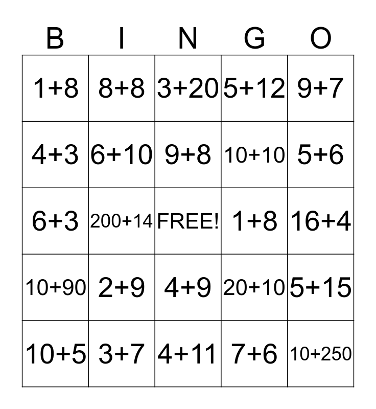 This bingo card has a free space and 24 words: 2+9, 3+7, 9+8, 10+5, 9+7, 1+8, 4+3, 8+8, 1+8, 4+9, 10+10, 6+3, 20+10, 5+15, 6+10, 7+6, 16+4, 3+20, 5+6, 200+14, 10+250, 10+90, 5+12 and 4+11.