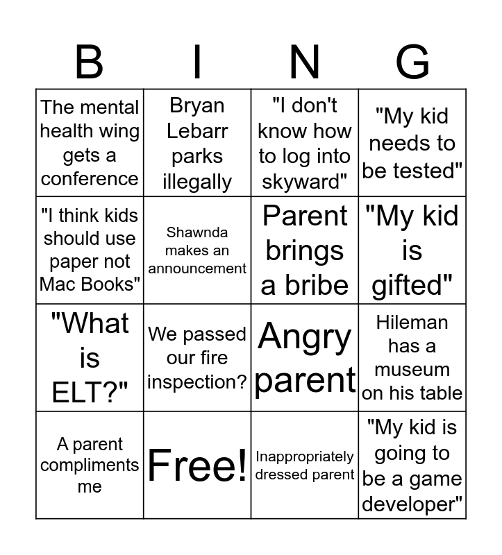 This bingo card has 25 words: Parent creeping on Cara, drunk parent, "My kid is gifted", Brad Scott gets a conference, "I think kids should use paper not Mac Books", The mental health wing gets a conference, Shawnda makes an announcement, Bryan Lebarr parks illegally, Free!, "How do you log into Canvas?", "What is ELT?", Angry parent, Drew W. makes 10 facial expressions, "My kid is just bored.", Parent brings a bribe, Melissa changes from heels to flats, Inappropriately dressed parent, "I don't know how to log into skyward", We passed our fire inspection?, Hileman has a museum on his table, A parent compliments me, Anderson brings out his turtle puppet, "My kid is going to be a game developer", "My kid needs to be tested" and didn't know today was conferences.