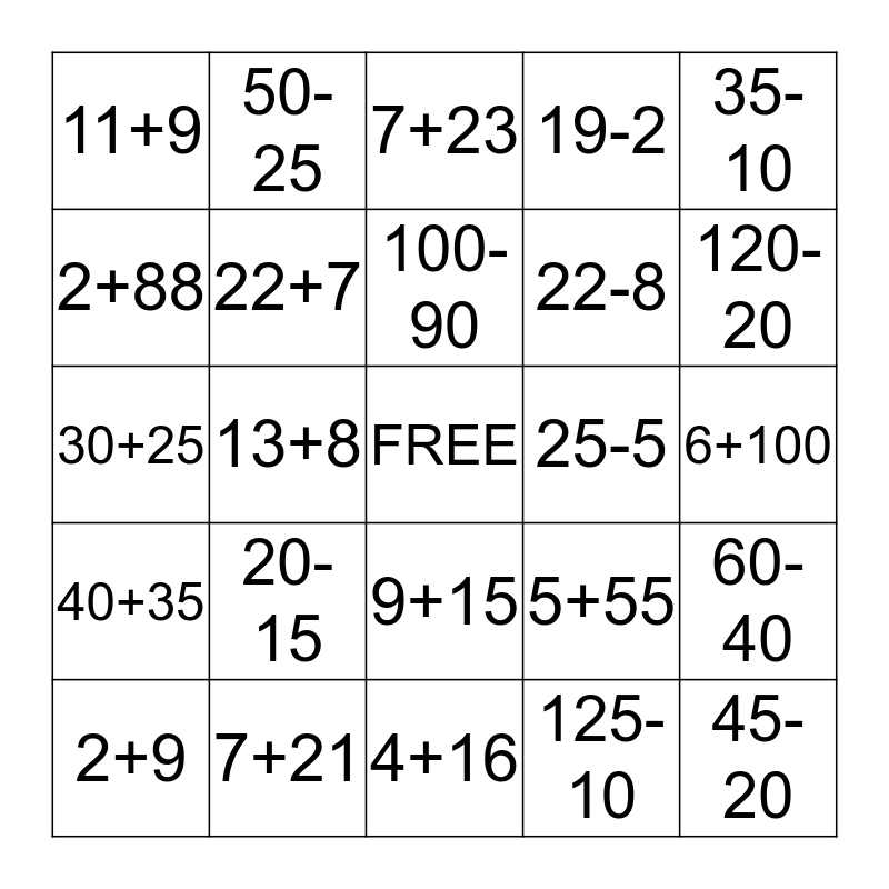 This bingo card has a free space and 24 words: 20-15, 7+21, 100-90, 2+9, 35-10, 11+9, 2+88, 50-25, 25-5, 9+15, 22-8, 30+25, 5+55, 60-40, 22+7, 125-10, 6+100, 7+23, 120-20, 13+8, 45-20, 40+35, 19-2 and 4+16.