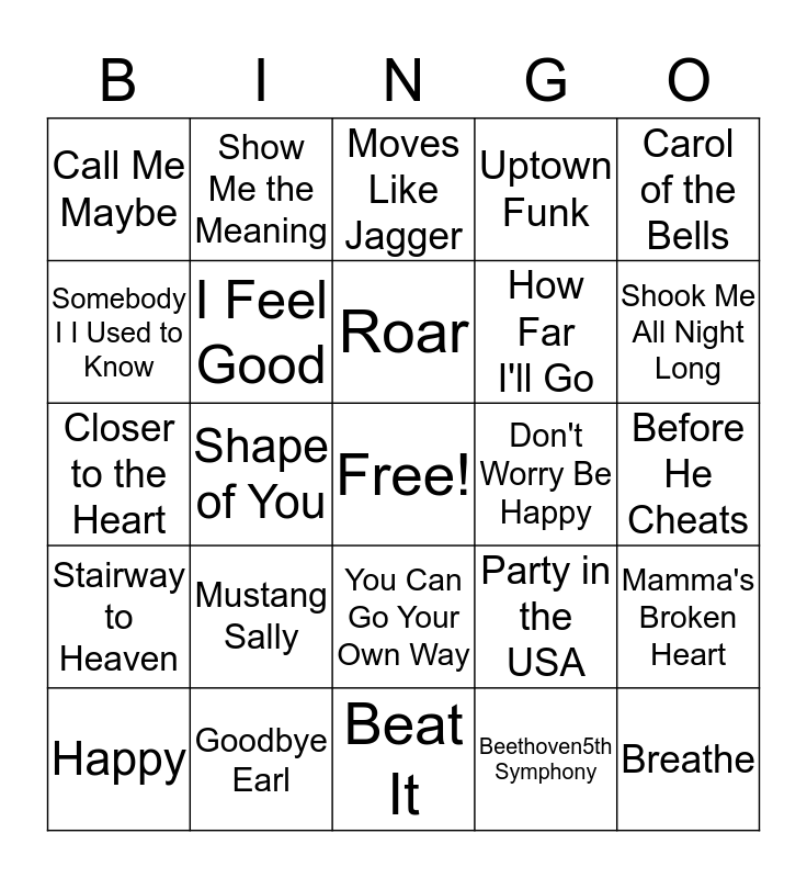 This bingo card has a free space and 28 words: Mamma's Broken Heart, Rolling in the Deep, How Far I'll Go, Beethoven5th Symphony, Somebody I I Used to Know, Moves Like Jagger, Show Me the Meaning, Stairway to Heaven, Don't Worry Be Happy, Happy, Closer to the Heart, Uptown Funk, Goodbye Earl, Beat It, Shook Me All Night Long, Blank Space, Mustang Sally, I Feel Good, Roar, You Can Go Your Own Way, Call Me Maybe, Beautiful Trauma, Breathe, Shape of You, Before He Cheats, Party in the USA, Carol of the Bells and All About That Bass.