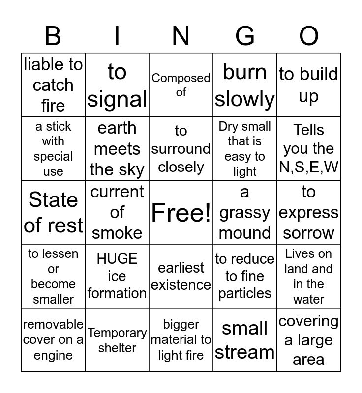 This bingo card has a free space and 29 words: unsteady movement of air, Temporary shelter, Composed of, Height from sea level, to build up, liable to catch fire, earth meets the sky, to surround closely, a grassy mound, Lives on land and in the water, removable cover on a engine, current of smoke, small stream, covering a large area, State of rest, Sharp point of a porcupine, bigger material to light fire, to reduce to fine particles, Tells you the N,S,E,W, to lessen or become smaller, HUGE ice formation, Value or useful, Dry small that is easy to light, to express sorrow, a stick with special use, to signal, earliest existence, burn slowly and rejoiced.
