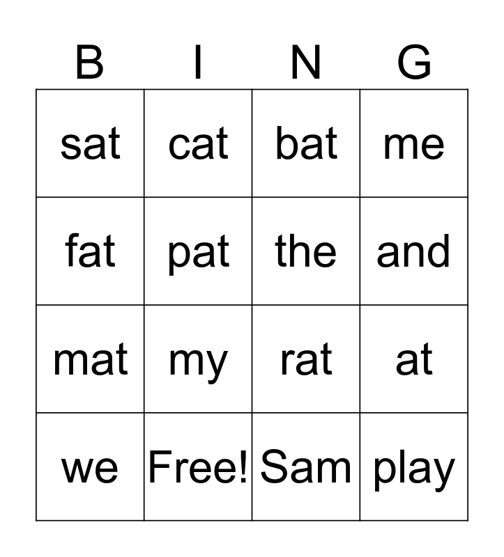 This bingo card has 16 words: Free!, at, bat, sat, mat, cat, rat, Sam, fat, pat, we, me, my, and, the and play.