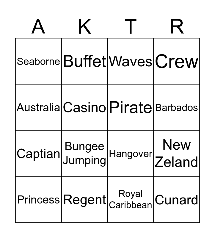 This bingo card has 52 words: Free!, Princess, Carnival, Limbo, Life Vest, Cabin, Buffet, Show, Casino, Overboard, Pirate, Suite, Queen Mary, Caribbean, Europe, Italy, Barbados, Regent, Oceana, Australia, New Zeland, Fiji, Seaborne, Captian, Shopping, Bar, Mai Tai, Excursion, Bungee Jumping, Tender, Purser, Crew, Bridge, Spa, Pool, Waves, Wine, Water Slide, Helicopter, Embark, Disembark, Royal Caribbean, Cunard, Muster, Rain, Sunny, Abandon Ship!, Hangover, Sea Sickness, Formal Night, Gym and Jacuzzi.