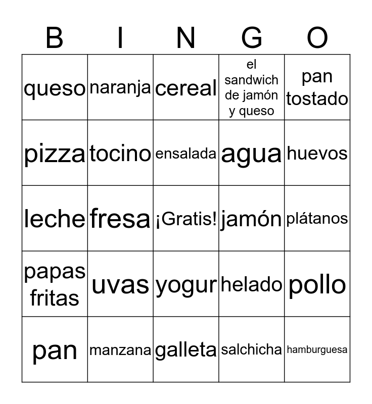 This bingo card has a free space and 24 words: uvas, manzana, ensalada, pan, pan tostado, queso, pizza, naranja, jamón, yogur, agua, leche, helado, pollo, tocino, salchicha, plátanos, cereal, huevos, fresa, hamburguesa, papas fritas, el sandwich de jamón y queso and galleta.