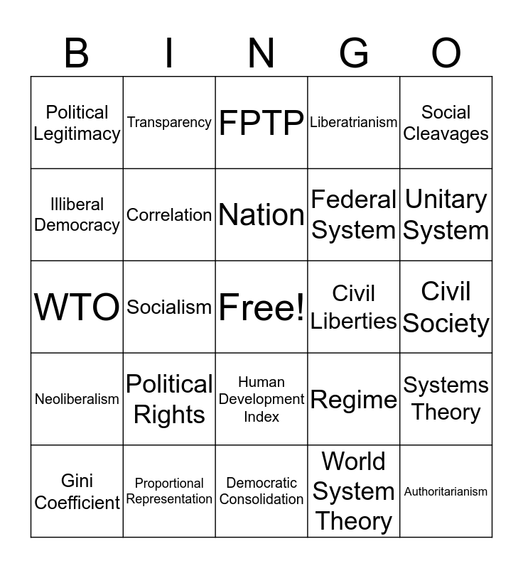 This bingo card has a free space and 39 words: Normative, Empirical, Causation, Correlation, Gini Coefficient, Human Development Index, Nation, State, Social Cleavages, Neoliberalism, Socialism, Liberatrianism, Authoritarianism, Civil Society, Civil Liberties, Political Rights, Political Efficacy, Political Legitimacy, Government, Regime, Illiberal Democracy, Democratic Consolidation, Federal System, Unitary System, Presidential System, Parliamentary System, Rule of Law, Soverignty, Referendum, Transparency, Civil Law, Common Law, FPTP, Proportional Representation, World System Theory, Modernization Theory, Systems Theory, WTO and EU.