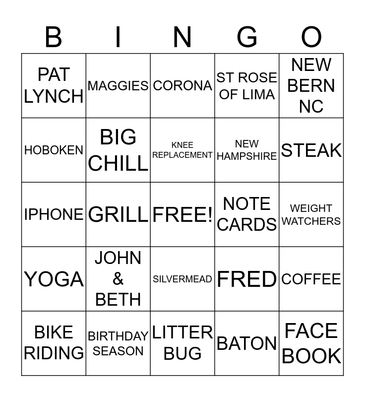 This bingo card has a free space and 24 words: JOHN & BETH, BIRTHDAY SEASON, KNEE REPLACEMENT, BIKE RIDING, NEW BERN NC, PAT LYNCH, HOBOKEN, MAGGIES, NOTE CARDS, SILVERMEAD, NEW HAMPSHIRE, IPHONE, FRED, COFFEE, BIG CHILL, BATON, WEIGHT WATCHERS, CORONA, STEAK, GRILL, FACE BOOK, YOGA, ST ROSE OF LIMA and LITTER BUG.