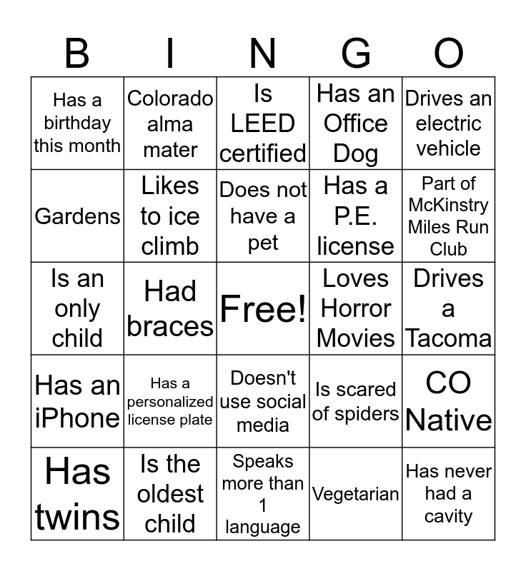 This bingo card has a free space and 65 words: AZ Native, Born on a Holiday, Born outside of the US, CO Native, Collects Funko Pops, College Athlete, Colorado alma mater, Currently engaged, Does not have a pet, Doesn't own a TV, Doesn't use social media, Doodle owner, Drives a Tacoma, Drives an electric vehicle, East coast transplant, Gardens, Had braces, Has a birthday this month, Has a kid in scouts, Has a P.E. license, Has a personalized license plate, Has an iPhone, Has an Office Dog, Has been at McK for <60 days, Has been at McK for 10+ years, Has been at McK for 6+ years, Has been skydiving, Has eaten Rocky Mountain Oysters, Has never had a cavity, Has P.E. license in multiple states, Has twins, Hiked a 14er, Is an only child, Is in a band, Is scared of spiders, Is the oldest child, Is the youngest child, Is an only child, Vegetarian, Left-handed, Likes to ice climb, Loves Fly fishing, Loves Horror Movies, Makes Homebrew, Married to a McK coworker, Non-coast transplant, Part of McKinstry Miles Run Club, Part of the Nerd Herd, Plays guitar, Ran a Marathon, recently married, Recently traveled abroad, Same last name, no relation, Speaks more than 1 language, Turned 40 in 2019, West coast transplant, Worked for sub or competitor before joining McK, Is LEED certified, Has a birthday the same month as you, Rides bike to work occasionally, Moved to Colorado in 2019, Won more than $100 in the lottery, Does not wear glasses or contacts, Has a masters degree and Doesn't drink coffee.