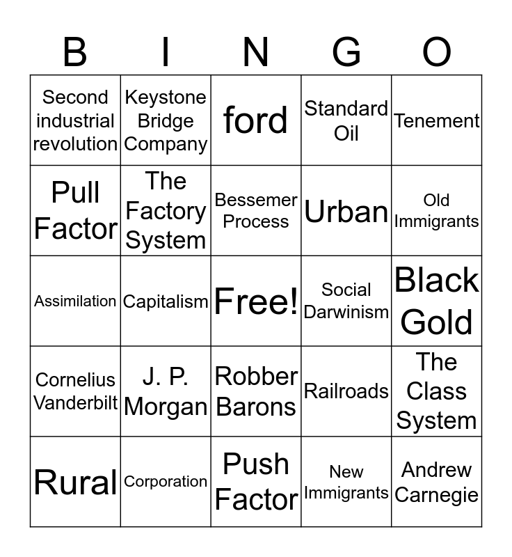 This bingo card has a free space and 28 words: John D. Rockefeller, Corporation, Bessemer Process, New Immigrants, Tenement, Second industrial revolution, The Factory System, Push Factor, Social Darwinism, The Class System, Assimilation, Capitalism, Railroads, Andrew Carnegie, Pull Factor, Steel, Robber Barons, Standard Oil, Old Immigrants, Rural, Keystone Bridge Company, Industrialization, Urban, Black Gold, Cornelius Vanderbilt, J. P. Morgan, ford and edison.