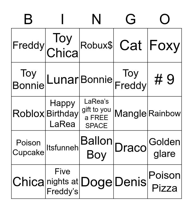 This bingo card has a free space and 24 words: Itsfunneh, Five nights at Freddy’s, Bonnie, Chica, Foxy, Freddy, Toy Bonnie, Toy Chica, Mangle, Ballon Boy, Toy Freddy, Roblox, Draco, Golden glare, Lunar, Denis, Rainbow, Robux$, # 9, Happy Birthday LaRea, Poison Pizza, Poison Cupcake, Cat and Doge.