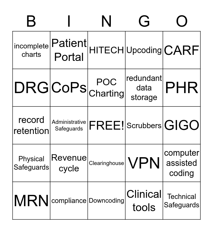This bingo card has a free space and 24 words: Revenue cycle, compliance, POC Charting, MRN, CARF, incomplete charts, DRG, Patient Portal, Scrubbers, Clearinghouse, redundant data storage, record retention, VPN, computer assisted coding, CoPs, Clinical tools, GIGO, HITECH, PHR, Administrative Safeguards, Technical Safeguards, Physical Safeguards, Upcoding and Downcoding.
