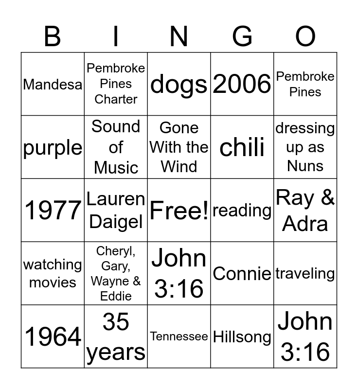 This bingo card has a free space and 27 words: Connie, spaghetti, chili, Tennessee, purple, dogs, Pembroke Pines Charter, watching movies, reading, traveling, 1977, 2006, 1964, 35 years, dressing up as Nuns, The Wizard of Oz, Sound of Music, Gone With the Wind, Cheryl, Gary, Wayne & Eddie, Mandesa, Ray & Adra, Hillsong, Lauren Daigel, John 3:16, John 3:16, Pembroke Pines and 1959.