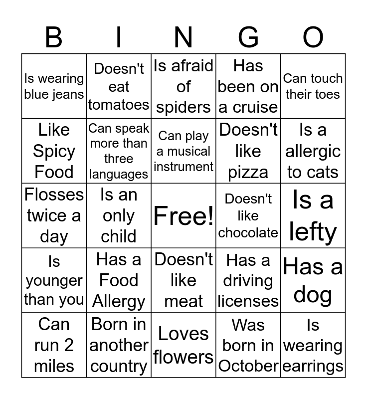 This bingo card has a free space and 24 words: Has a Food Allergy, Born in another country, Can play a musical instrument, Can run 2 miles, Can touch their toes, Is wearing blue jeans, Like Spicy Food, Doesn't eat tomatoes, Doesn't like chocolate, Doesn't like meat, Doesn't like pizza, Flosses twice a day, Has a driving licenses, Has a dog, Can speak more than three languages, Was born in October, Is a lefty, Is afraid of spiders, Is a allergic to cats, Is an only child, Is wearing earrings, Is younger than you, Has been on a cruise and Loves flowers.