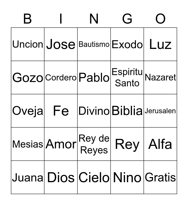 This bingo card has 30 words: Dios, Maria, Fe, Oracion, Uncion, Bautismo, Cordero, Rey de Reyes, Biblia, Cielo, Jerusalen, Divino, Nino, Gratis, Nazaret, Jehova, Rey, Mesias, Amor, Luz, Oveja, Perdon, Jose, Espiritu Santo, Gozo, Exodo, Alfa, Juana, Pablo and Salmon.